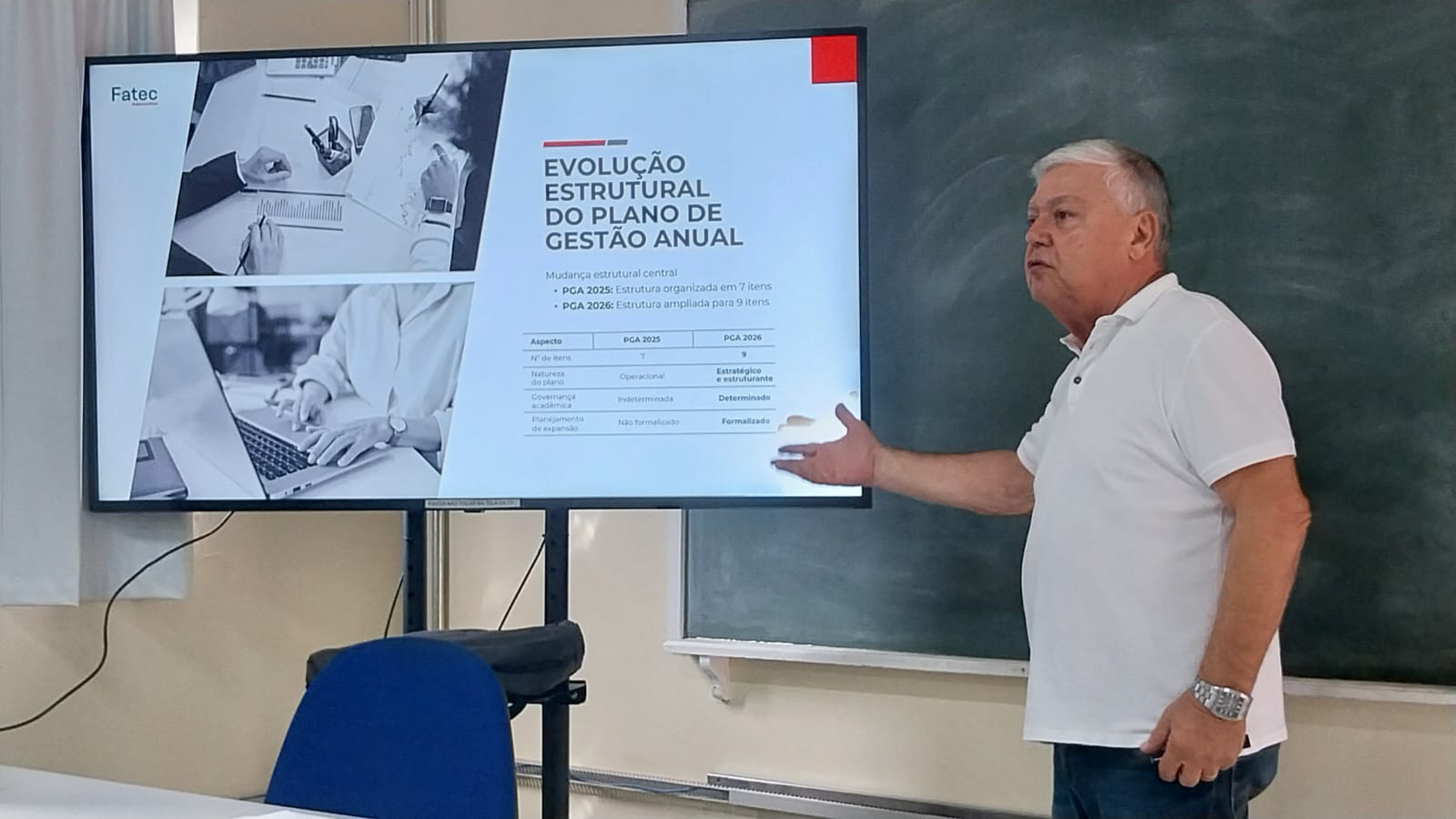 Entre os temas abordados estiveram o Plano de Desenvolvimento Institucional (PDI), que define as diretrizes para os próximos cinco anos, o relatório da Comissão Própria de Avaliação (CPA), o Plano de Gestão Anual (PGA), que orienta as ações da unidade ano a ano, e o Relatório Anual de Atividades (RAA). Também foram apresentados os resultados do PGA 2025, publicados em uma revista que será disponibilizada no site oficial da Fatec Adamantina, além dos processos de desenvolvimento do PGA 2026, que será executado ao longo do Ano Letivo.