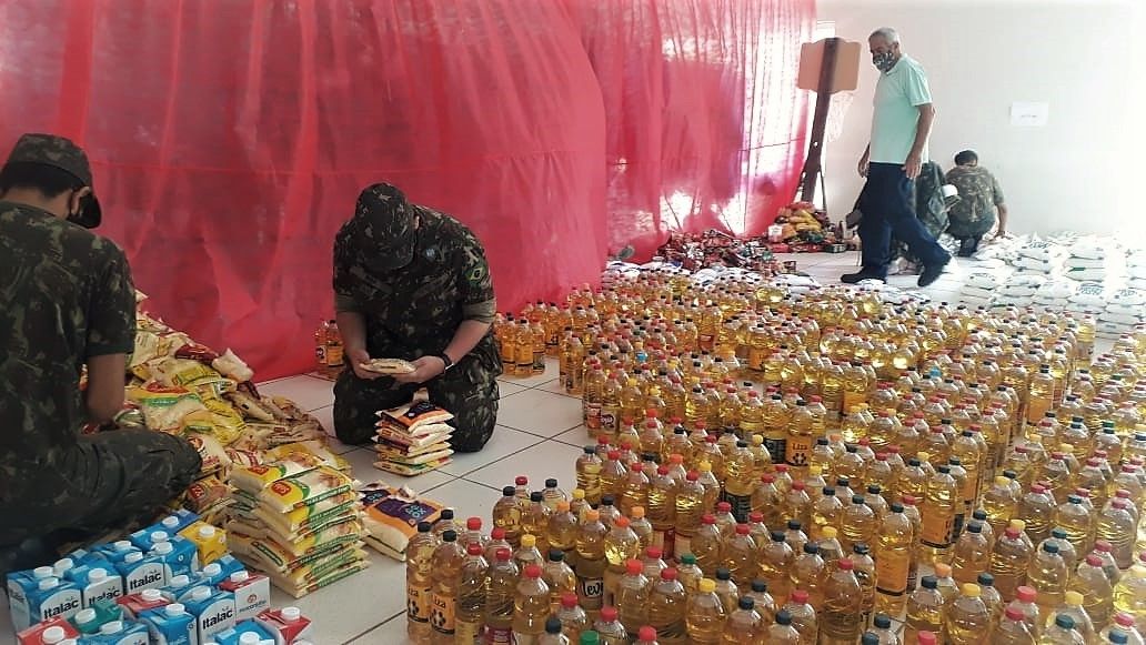 Foto 1: Voluntários do Tiro de Guerra realizando a organização dos alimentos arrecadados.