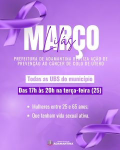 Nesta terça-feira (25), todas as unidades básicas de saúde de Adamantina estarão abertas até às 20h para possibilitar que mulheres que tem entre 25 e 65 anos e que tenham vida sexual ativa realizem o exame Papanicolau. O objetivo do exame é prevenir o câncer de colo de útero.
