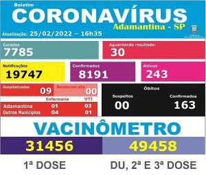 Boletim desta sexta-feira (25) do município de Adamantina sobre os casos de COVID-19. Conforme informações da Vigilância Epidemiológica, esses dados são referentes ao dia 24 de fevereiro.VACINAÇÃOAté ontem (24), às 16h, foram aplicadas em crianças (05 a 11 anos), adolescentes (12 a 17 anos) e adultos em Adamantina 80.914 doses de vacina contra a COVID-19.Receberam a primeira dose do imunizante 89,5% que consiste em 31.456 pessoas, 88,2% que equivale a 30.983 pessoas já receberam a segunda dose ou tomaram dose única e 18.475 pessoas receberam a terceira dose.Já estão vacinadas com a primeira dose cerca de 1.491 crianças e cerca de 06 crianças receberam a segunda dose. O total de crianças indicadas para a vacinação no município de Adamantina é 2.563.