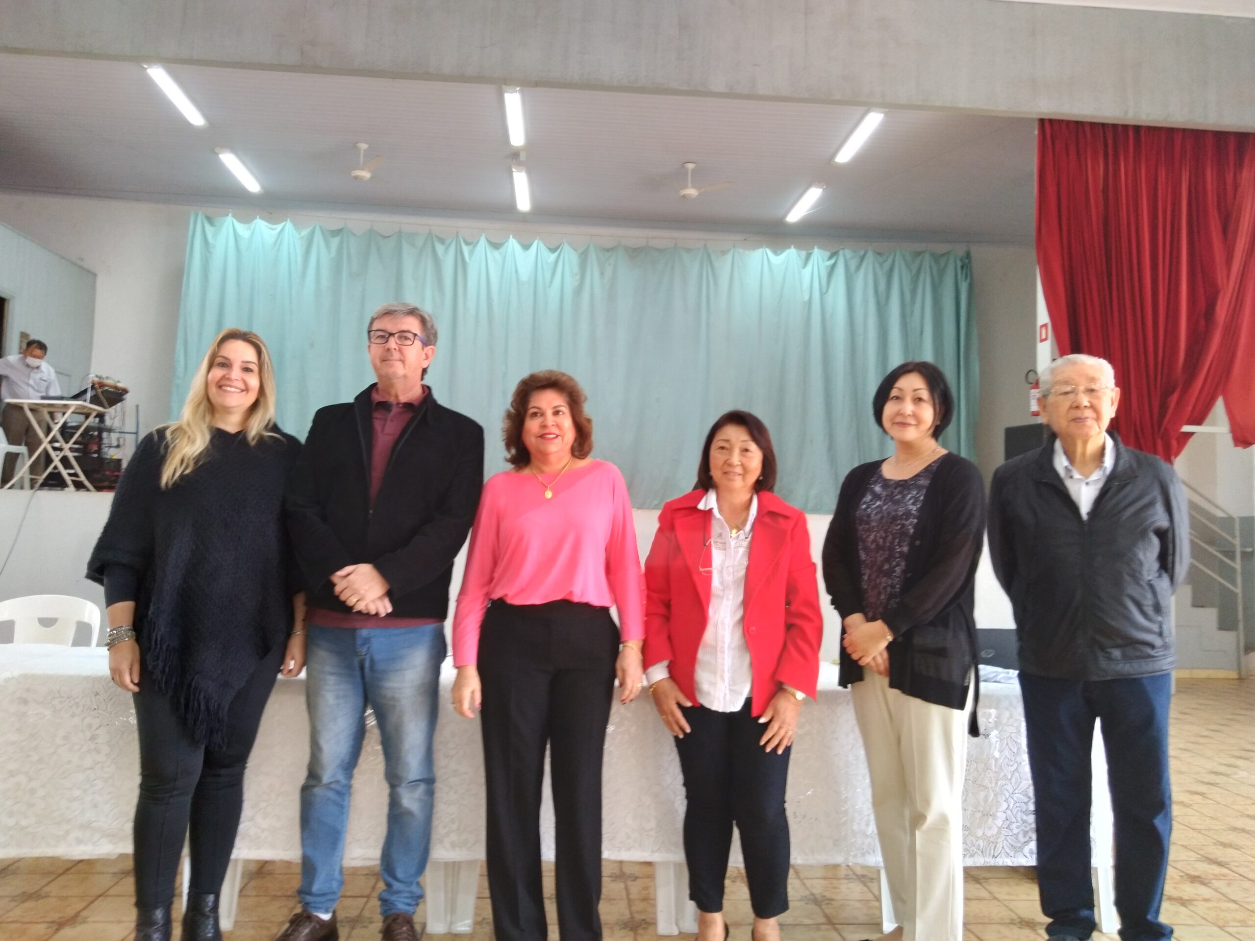 Representando o prof. Dr. Alexandre Teixeira de Souza, reitor da UniFAI, a prof. Drª Liliana Tofoli, Pró-Reitora de Extensão; o presidente da Câmara Municipal, Paulo Cervelheira; a vice-prefeita de Adamantina, Maria de Lourdes Santos Gil representando o prefeito Márcio Cardim; o Sr. Yuske Miyamura, vice-presidente da ACREA; e Noriko Onishi Saito, presidente, a Srª Natsuko Yamamoto, representando a JICA.