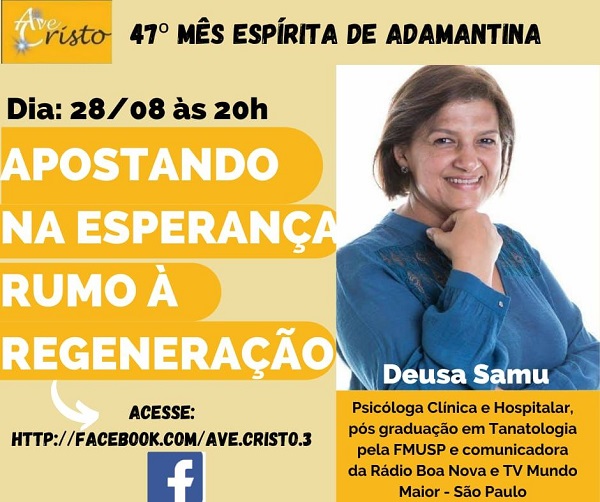 Dando sequência às atividades do 47º Mês Espírita, o Ave Cristo convida para a palestra com a Psicóloga Clínica e Hospitalar, Deusa Samu.