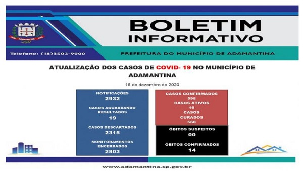 Nota: A Prefeitura de Adamantina informa que existem 19 testes aguardando resultado, pois os mesmos foram enviados para análise do Adolf Lutz. No entanto, isso está acontecendo de forma temporária, pois a Secretaria de Saúde, já fez a aquisição de uma nova remessa de testes e assim que eles chegarem, os resultados voltam a ser liberados na cidade.