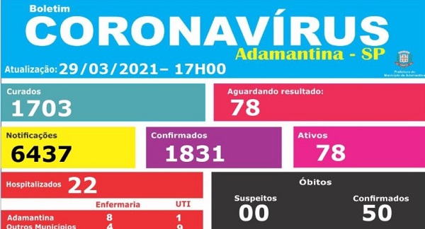 A Prefeitura de Adamantina informa que existem 78 testes aguardando resultado. Eles foram enviados para análise do Adolf Lutz.