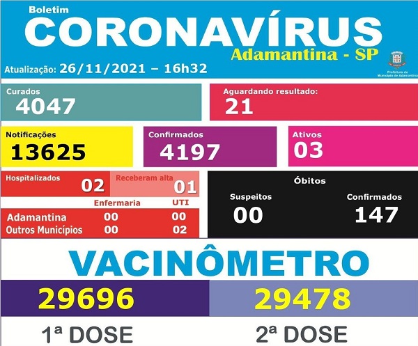 Até hoje (26), às 9h, foram aplicadas em Adamantina 64.178 doses de vacina contra a COVID-19. Receberam a primeira dose do imunizante 90,6% da população adulta indicada para ser imunizada que consiste em 27.473 pessoas e 95,6% que equivale a 28.104 pessoas já estão com o esquema vacinal completo ou tomaram dose única. 4.889 pessoas receberam a terceira dose. A população adulta indicada para a vacinação é de 30.312.