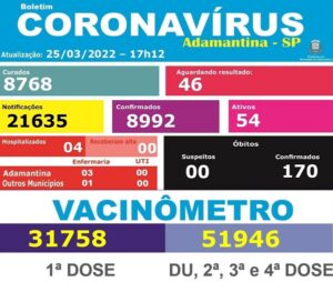 Boletim desta sexta-feira (25) do município de Adamantina sobre os casos de COVID-19.  Conforme informações da Vigilância Epidemiológica, esses dados são referentes ao dia 24 de março.