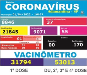Boletim desta sexta-feira (01) do município de Adamantina sobre os casos de COVID-19. Conforme informações da Vigilância Epidemiológica, esses dados são referentes ao dia 31 de março.VACINAÇÃOAté hoje (01), às 07h, foram aplicadas em crianças de (05 a 11 anos), adolescentes (12 a 17) e adultos em Adamantina 84.807 doses de vacina contra a COVID-19.Receberam a primeira dose do imunizante 90,5% que consiste em 31.794 pessoas, 90,8% que equivale a 31.904 pessoas já receberam a segunda dose ou tomaram a dose única, 20.719 receberam a terceira dose e 390 pessoas já tomaram a quarta dose.Já estão vacinadas com a primeira dose cerca de 1.775 crianças e cerca de 736 crianças receberam a segunda dose. O total de crianças indicadas para a vacinação no município de Adamantina é de 2.563.