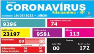 Boletim desta quinta-feira (19) do município de Adamantina sobre os casos de COVID-19. Conforme informações da Vigilância Epidemiológica, esses dados são referentes ao dia 18 de maio.