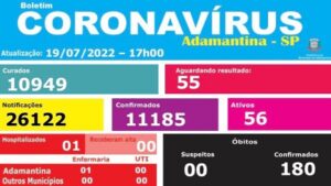 Boletim desta terça-feira (19) do município de Adamantina sobre os casos de COVID-19. Conforme informações da Vigilância Epidemiológica, esses dados são referentes ao dia 18 de julho.