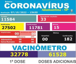 Boletim desta sexta-feira (07) do município de Adamantina sobre os casos de COVID-19. Conforme informações da Vigilância Epidemiológica, esses dados são referentes ao dia 06 de outubro.