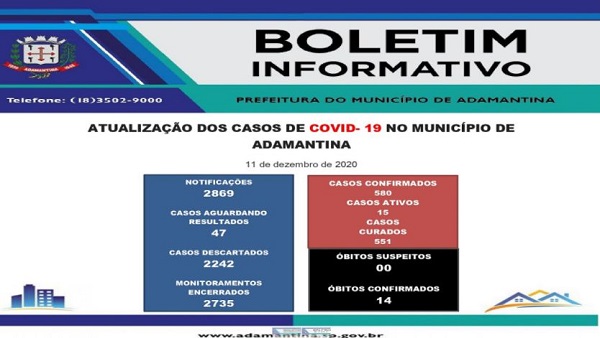 Nota: A Prefeitura de Adamantina informa que existem 47 testes aguardando resultado, pois os mesmos foram enviados para análise do Adolf Lutz. No entanto, isso está acontecendo de forma temporária, pois a Secretaria de Saúde, já fez a aquisição de uma nova remessa de testes e assim que eles chegarem, os resultados voltam a ser liberados na cidade.