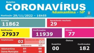 Boletim desta terça-feira (29) do município de Adamantina sobre os casos de COVID-19. Conforme informações da Vigilância Epidemiológica, esses dados são referentes ao dia 28 de novembro.