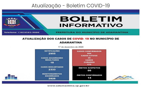 Nota: A Prefeitura de Adamantina informa que existem 18 testes aguardando resultado, pois os mesmos foram enviados para análise do Adolf Lutz. No entanto, isso está acontecendo de forma temporária, pois a Secretaria de Saúde, já fez a aquisição de uma nova remessa de testes e assim que eles chegarem, os resultados voltam a ser liberados na cidade.