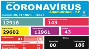 Boletim desta sexta-feira (20) do município de Adamantina sobre os casos de COVID-19. Conforme informações da Vigilância Epidemiológica, esses dados são referentes aos dias 13, 14, 15, 16, 17, 18 e 19 de janeiro.