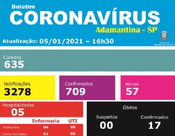 Conforme informações da Vigilância Epidemiológica, esses dados são referentes aos dias 31 de dezembro de 2020 e 04 de janeiro de 2021.