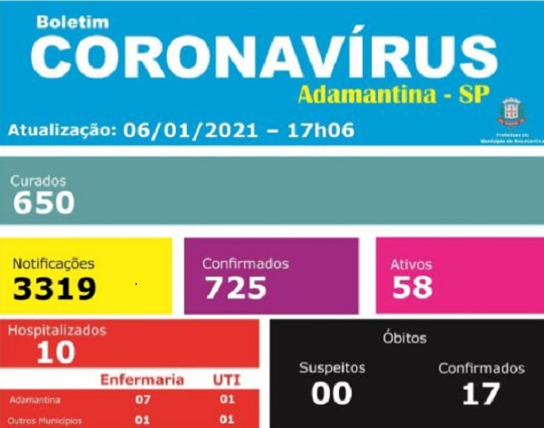 Conforme informações da Vigilância Epidemiológica, esses dados são referentes ao dia 05 de janeiro de 2021.