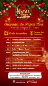 O que já se sabe é que a Prefeitura de Adamantina fará uma programação especial para marcar a chegada do “bom velhinho” que terá início às 16h no Parque dos Pioneiros. Já a previsão de chegada do Papai Noel no município está prevista para às 18h.
