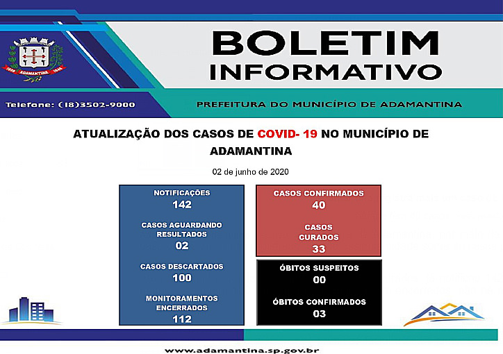 Até o momento, a cidade conta com 33 casos curados, já notificou 142 casos, aguarda resultado de dois exames, negativos somam 100, 112 monitoramentos foram encerrados, não há nenhum óbito suspeito e três óbitos já foram confirmados.