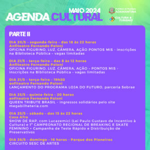 A agenda cultural chega ao fim com atividades no sábado(25) e no domingo(26). A Casa Afro recebe no sábado (25), o 1º Campeonato Regional de Breaking e Skate Feminino e mais o show de rap com Lucazemici.
