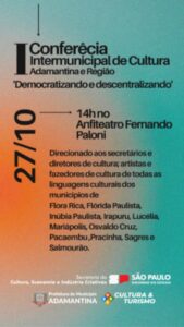 Adamantina sediará na próxima sexta-feira, 27 de outubro, a I Conferência Intermunicipal de Cultura. Com o tema “Democratizando e descentralizando”, a programação acontecerá a partir das 14h no Anfiteatro Fernando Paloni.