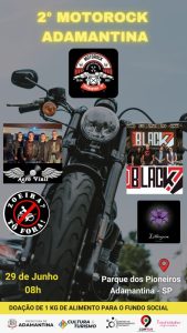 Adamantina terá a 2ª edição do Moto Rock. A programação integra os 76 anos do município e tem início às 8h no Parque dos Pioneiros. Motociclistas de Adamantina e região já confirmaram sua presença, assim como outros de diversas regiões do estado, incluindo a grande São Paulo, os estados do Paraná e Mato Grosso do Sul, o evento já conta com a confirmação de mais de 60 brasões.