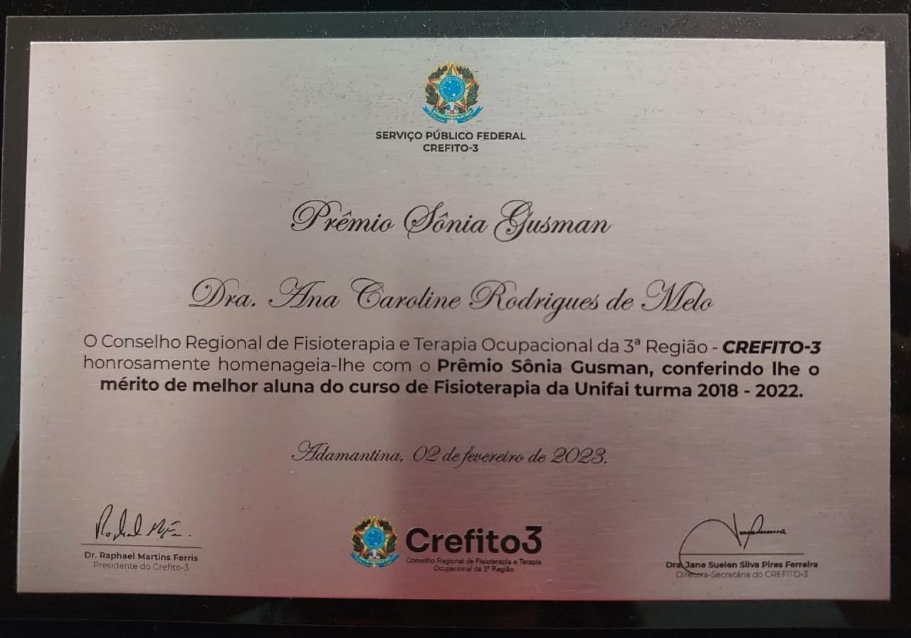 Mais uma vez, o Centro Universitário de Adamantina (UniFAI) é destaque em cenário estadual. A aluna do curso de Fisioterapia Ana Caroline Rodrigues de Melo recebeu o primeiro Prêmio de Honra ao Mérito “Dra. Sônia Gusman”, concedido pelo Conselho Regional de Fisioterapia e Terapia Ocupacional do Estado de São Paulo (CREFITO 3).