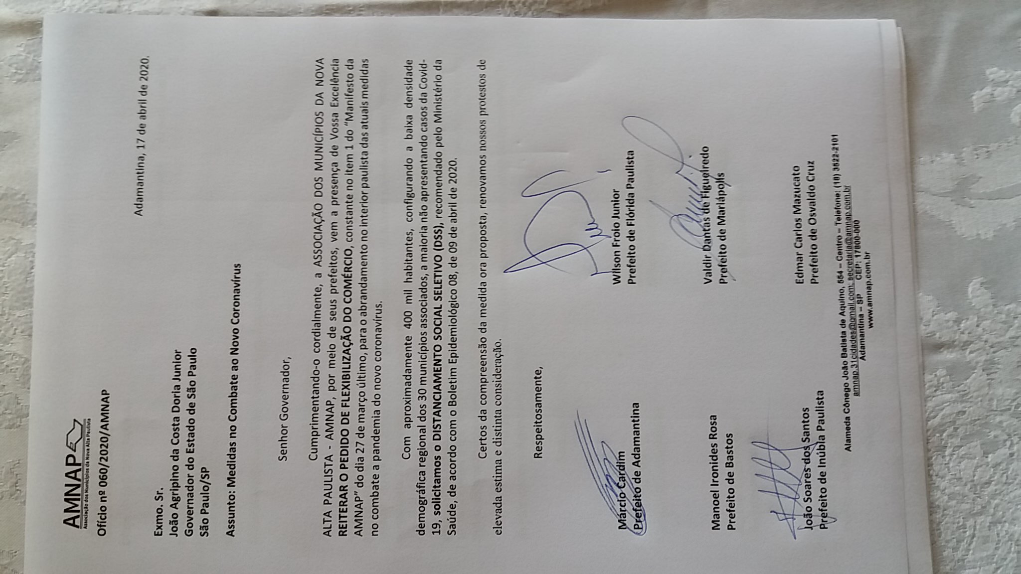 Os prefeitos encaminharam ofício ao governador João Doria, reiterando o pedido de flexibilização do comércio, constante no “Manifesto da AMNAP”, do dia 27/03/2020.