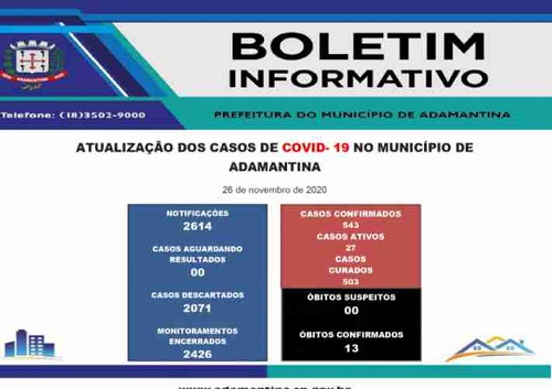 24/11/2020 17h37 Conforme informações da Vigilância Epidemiológica, esses dados são referentes ao dia 23 de novembro. PREFEITURA DO MUNICÍPIO DE ADAMANTINA