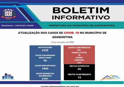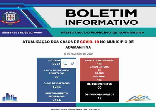 20/11/2020 17h27 Conforme informações da Vigilância Epidemiológica, esses dados são referentes ao dia 19 de novembro. PREFEITURA DO MUNICÍPIO DE ADAMANTINA