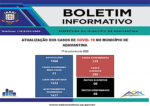 17/09/2020 17h15 296 munícipes estão recuperados A Prefeitura de Adamantina, por meio da Secretaria de Saúde, informa que hoje (17) mais um caso foi confirmado