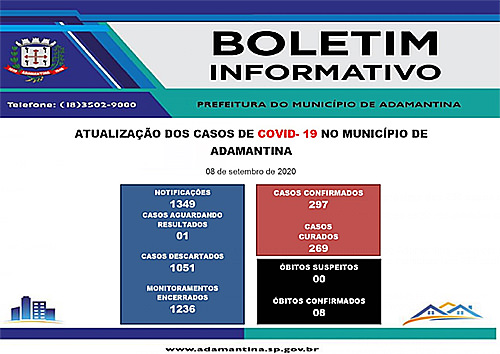 16/09/2020 17h34 294 munícipes estão recuperados A Prefeitura de Adamantina, por meio da Secretaria de Saúde, informa que hoje (16) mais cinco casos foram confirmados