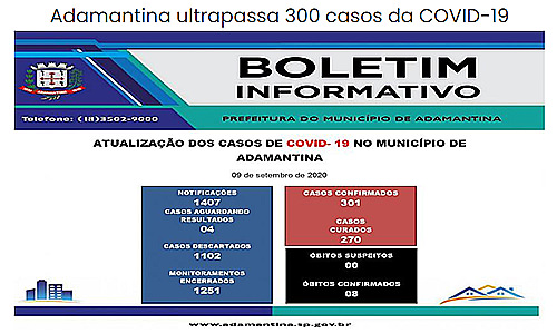 09/09/2020 18h10 A Prefeitura de Adamantina, por meio da Secretaria de Saúde, informa que hoje (09) mais 4 casos foram confirmados na cidade. Com isso,