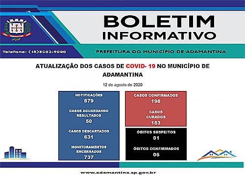 20/08/2020 16h59 210 munícipes estão curados A Prefeitura de Adamantina, por meio da Secretaria de Saúde, informa que hoje (20), nenhum novo caso foi confirmado