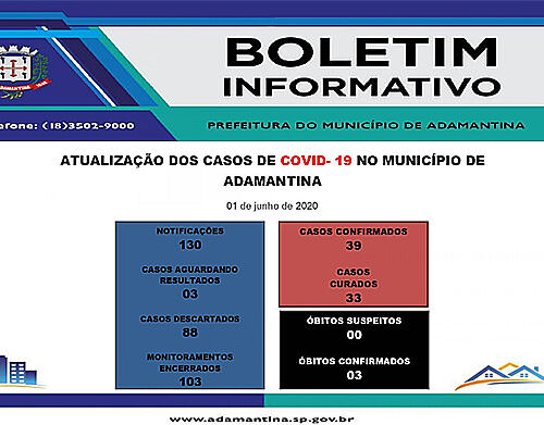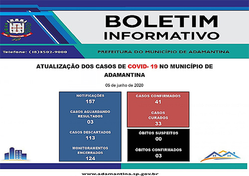 02/06/2020 23h50 Cidade tem 40 casos confirmados A Prefeitura de Adamantina, por meio da Secretaria de Saúde, informa que mais um caso de COVID-19 foi