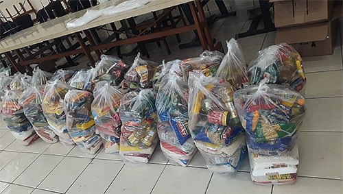 02/06/2020 16h02 Cestas foram montadas com os alimentos e itens de higiene pessoal e de limpeza arrecadados durante a distribuição das máscaras de proteção facial