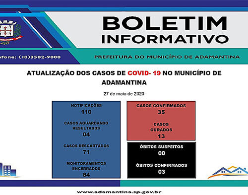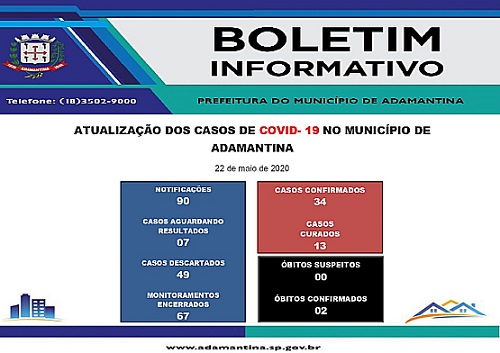 21/05/2020 A Secretaria de Saúde de Adamantina informa: nesta quinta-feira (21) mais um caso positivo da COVID-19 foi registrado. Outro caso suspeito recebeu resultado negativo