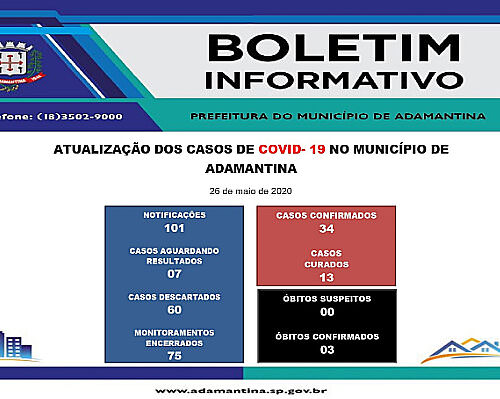 26/05/2020 20h18 A Secretaria de Saúde de Adamantina informa: nesta terça-feira (26) mais um óbito foi registrado para o município de Adamantina. O terceiro óbito