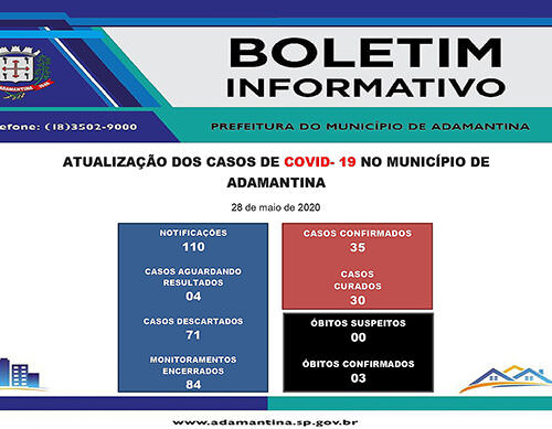 29/05/2020 17h23 Apesar das confirmações, a cidade tem mais um caso curado, subindo de 30 para 31 – A Prefeitura de Adamantina, por meio da Secretaria