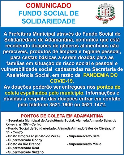 02/04/2020 17h51 O Fundo Social de Solidariedade de Adamantina comunica que está recebendo doações de alimentos não perecíveis, produtos de limpeza e higiene pessoal para