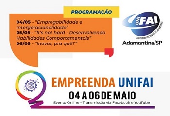 03/05/2021 17h35 UniFAI promove Empreenda 2021 de 4 a 6 de maio Programação contempla pontos significativos para o desenvolvimento de pessoas nas organizações Por Priscila