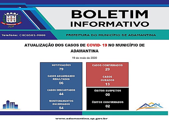 Com isso, Adamantina segue com: 79 notificações, 06 que aguardam resultados, 44 casos negativos, 54 monitoramentos encerrados, 29 casos positivos, nenhum óbito suspeito e 02 óbitos confirmados.
