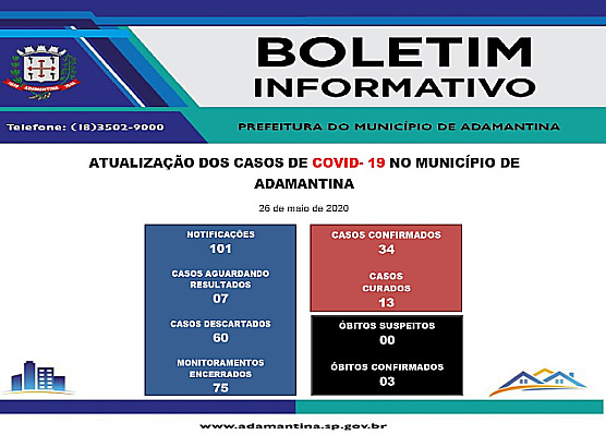 Até o momento, Adamantina segue com 101 notificações, 07 casos aguardando resultados, 34 casos positivos, 60 casos negativos, nenhum óbito suspeito, 03 óbitos confirmados e 75 monitoramentos encerrados.