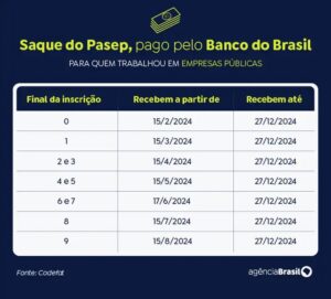 O PIS é pago pela Caixa Econômica Federal; e o Pasep, pelo Banco do Brasil. Como ocorre tradicionalmente, os pagamentos serão divididos em seis lotes, baseados no mês de nascimento, no caso do PIS, e no número final de inscrição, no caso do Pasep. O saque começará nas datas de liberação dos lotes e acabarão em 27 de dezembro de 2024. Após esse prazo, será necessário aguardar convocação especial do Ministério do Trabalho e Previdência.