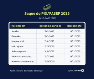 Cerca de 3,6 milhões de trabalhadores com carteira assinada nascidos em novembro e dezembro e que ganham até dois salários mínimos podem sacar, a partir desta sexta-feira (15), o valor do abono salarial do Programa de Integração Social (PIS) e do Programa de Formação do Patrimônio do Servidor Público (Pasep) em 2025 (ano-base 2023). A quantia está disponível no Portal Gov.br.