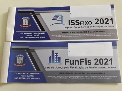 A partir de sexta-feira (22), os contribuintes de Adamantina começam a receber os carnês do para pagamento do Imposto Sobre Serviços (ISS-Fixo) e da Taxa de Licença para Fiscalização de Funcionamento (Alvará) que estão sendo enviados pelos Correios. A primeira parcela vence no dia 20 de fevereiro.