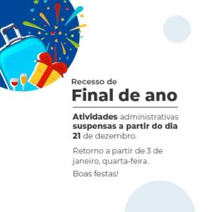 Sendo assim, haverá expediente normal na Instituição até esta quarta-feira, dia 20 de dezembro, com retorno a partir de 3 de janeiro, também quarta.