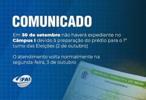 Devido à cessão do prédio à Justiça Eleitoral para a instalação de seções de votação do 1º Turno das Eleições Presidenciais 2022, não haverá expediente no Câmpus I (rua Nove de Julho, 730) do Centro Universitário de Adamantina (UniFAI) nesta sexta-feira, 30 de setembro.