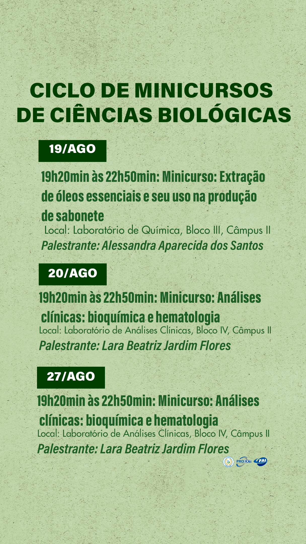 “Tradicionalmente, o curso de Ciências Biológicas sempre promoveu a Semana Acadêmica da Biologia no início de setembro como forma, também, de comemorar o dia do biólogo. Neste ano, optamos pelo ciclo de minicursos para melhor atender aos anseios dos nossos graduandos por oportunidades de desenvolvimento prático”, explica a coordenadora do curso de Ciências Biológicas, Prof.ª Dra. Ana Carolina Basílio-Palmieri.