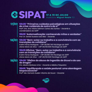 “Devido ao projeto desenvolvido pelo SAPP voltado à saúde do trabalhador, se tornou nosso parceiro desde a edição do ano passado. Este ano, o SAPP contribuirá com duas palestras e uma oficina: a palestra da quarta-feira, 17, ministrada pela coordenadora do SAPP e docente da instituição, Prof.ª Dra. Ana Vitória Salimon Carlos dos Santos, e a palestra e a oficina do dia 18, ministradas e mediadas pelas psicólogas do SAPP, Evelini Ferraz Rodrigues e Liliane Maria da Silva”, explica o vice-presidente da CIPA gestão 2024/2025, Mateus Vitorelli.