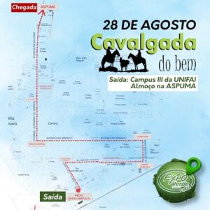 A saída Cavalgada do Bem está marcada para às 10h do Campus III da Unifai. De lá, os cavaleiros seguem até o Campus II da UniFAI, percorrem a Avenida Rio Branco até a altura do Banco do Brasil seguindo pela Avenida Adhemar de Barros até a Associação dos Servidores Públicos Municipais de Adamantina (Aspuma) onde o almoço será servido a partir das 12h,